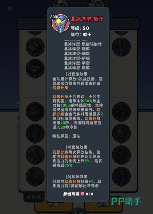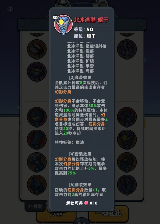 在套装协同方面,推荐采用“北冰洋六件套 + 擎天型二件套”的外圈组合:前者提供幻影分身效果,显著提升单位时间内物理/神圣伤害释放频次;后者赋予能量块机制,直接强化物理伤害倍率。内圈则强烈推荐红莲型三件套——其效果为幸存者释放战技后,有50%概率立即重置战技冷却,且该判定每3秒自动触发一次。高频战技释放可加速达成天际砖头所需的10次伤害前置条件,形成正向循环。