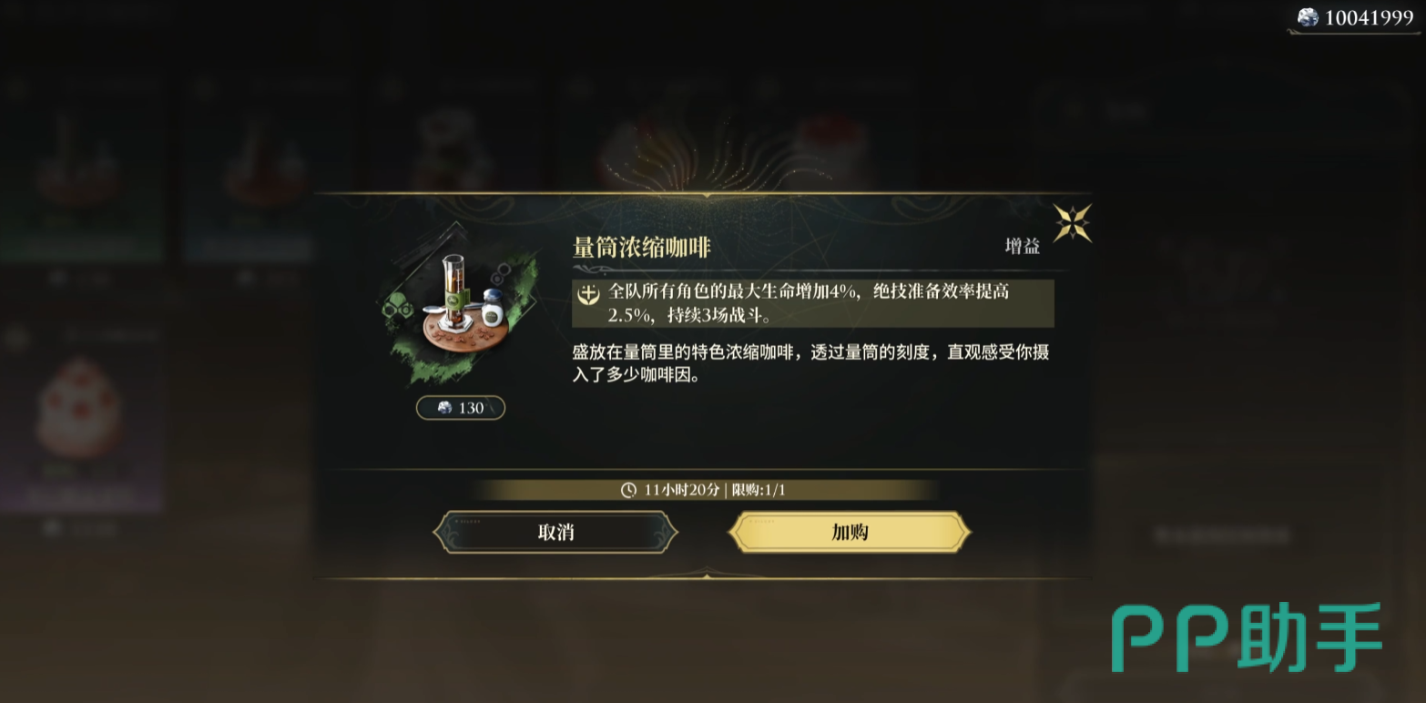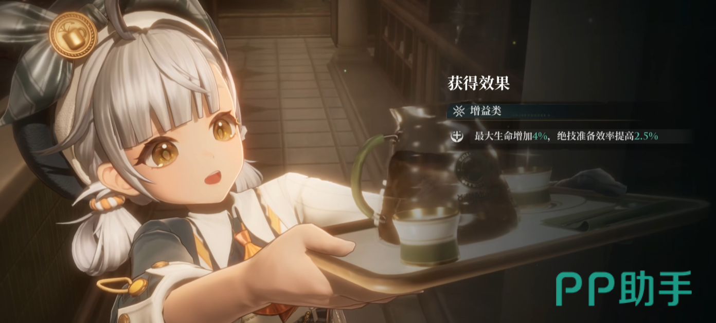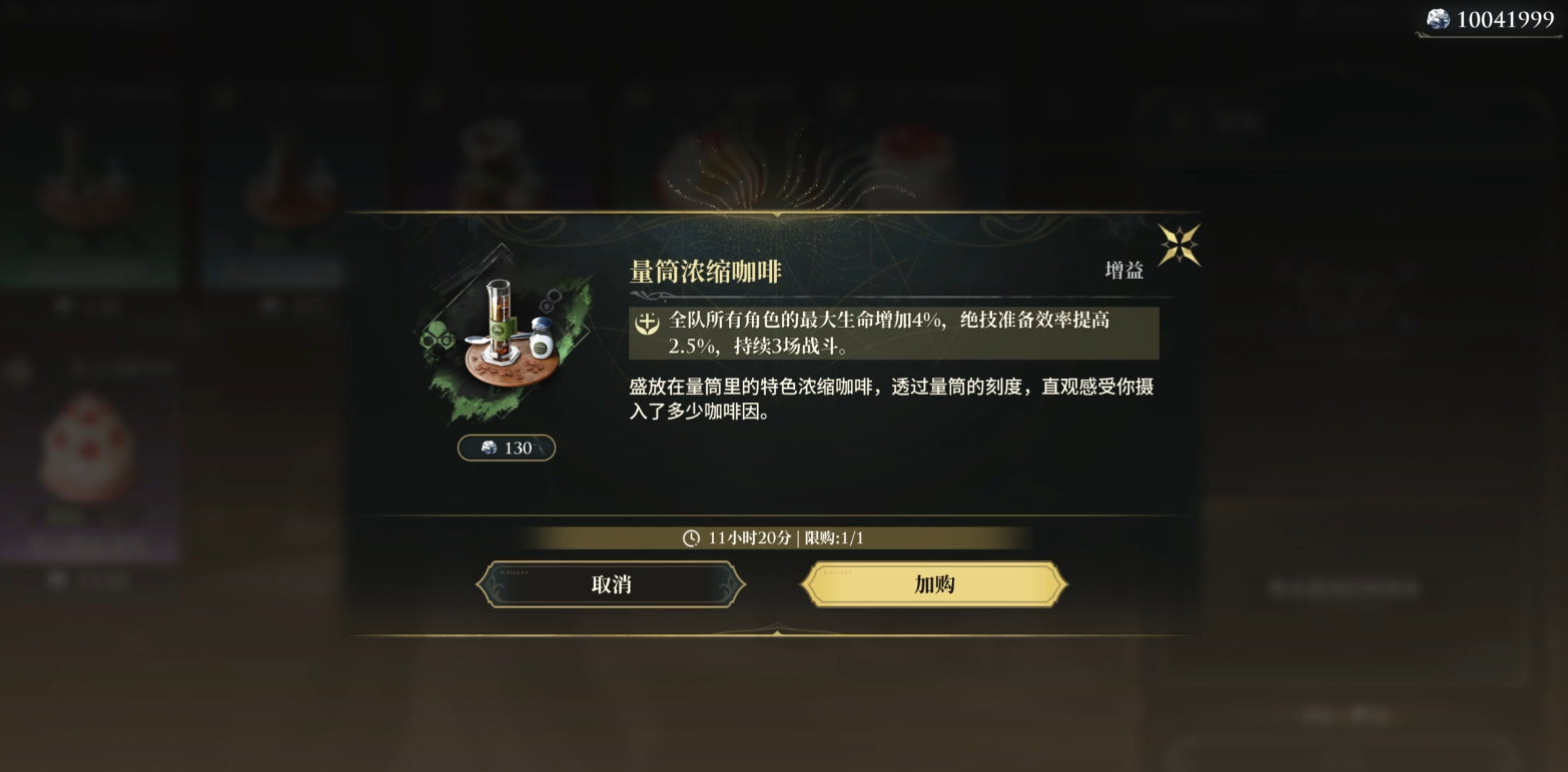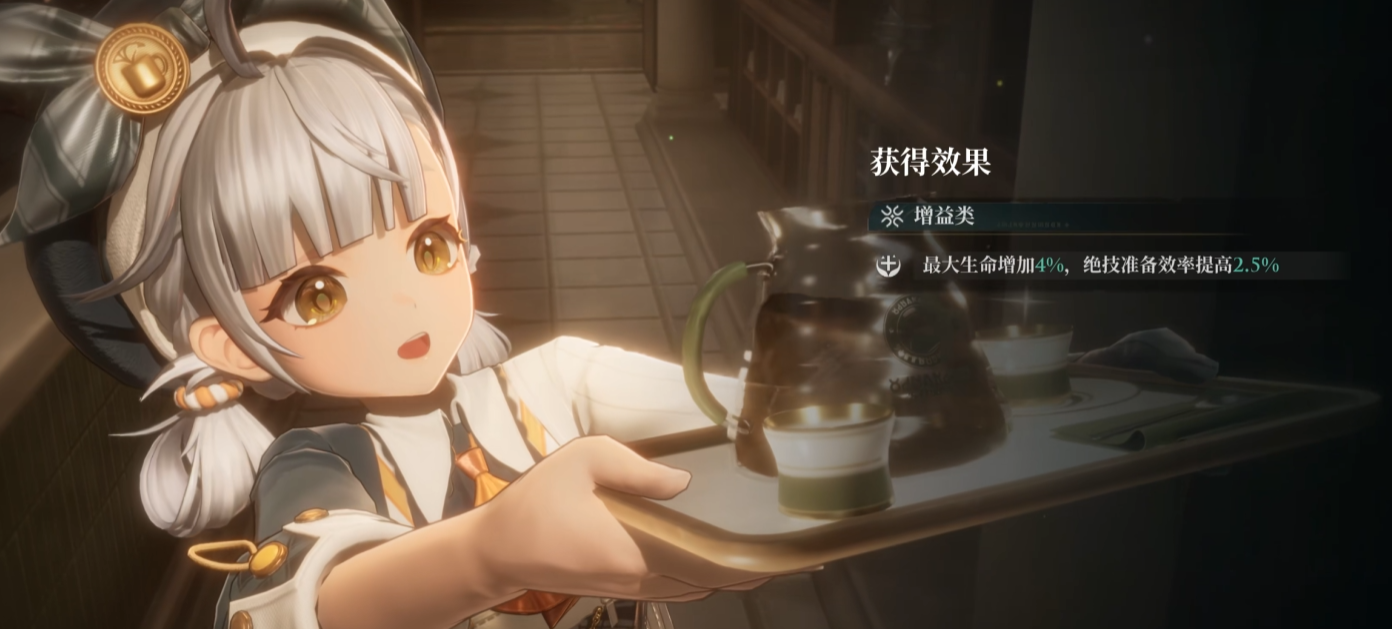 该咖啡厅提供多款功能性饮品与甜点,全部以银子为货币单位进行交易。其中最具代表性的“量筒浓缩咖啡”,饮用后可为全体队友提供持续性增益:最大生命值提升4%,同时提高大招释放效率。此类效果属于即时生效、限时存在的战斗辅助Buff,需在任务或战斗前合理规划使用时机。