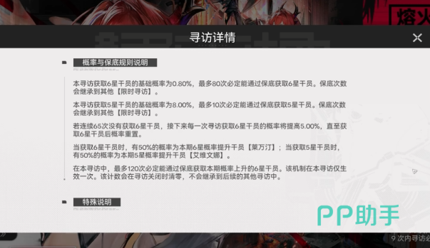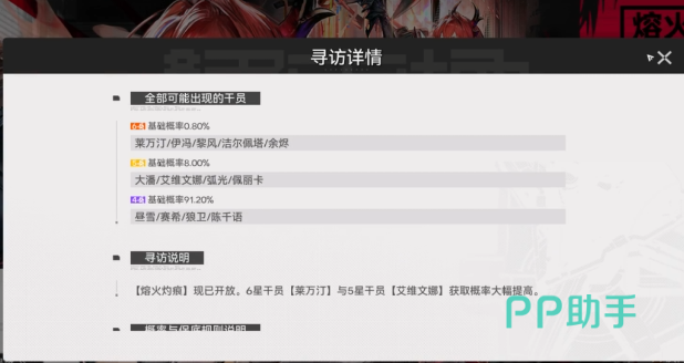 相较于常驻卡池,本池具备三项差异化设计:其一,六星干员基础出率提升;其二,独立保底规则(含软保底与硬保底双层机制);其三,每次寻访均额外赠送「炽焰铸模」道具,该道具用于后续「武器共鸣」系统中定向获取与干员属性契合的专属近战装备。