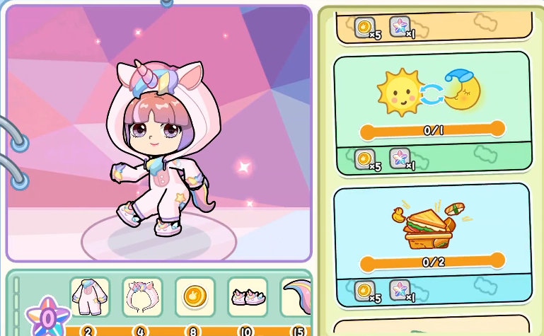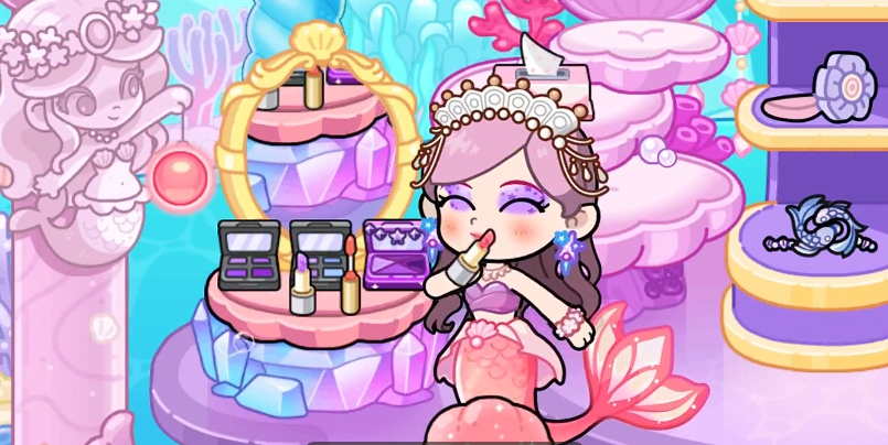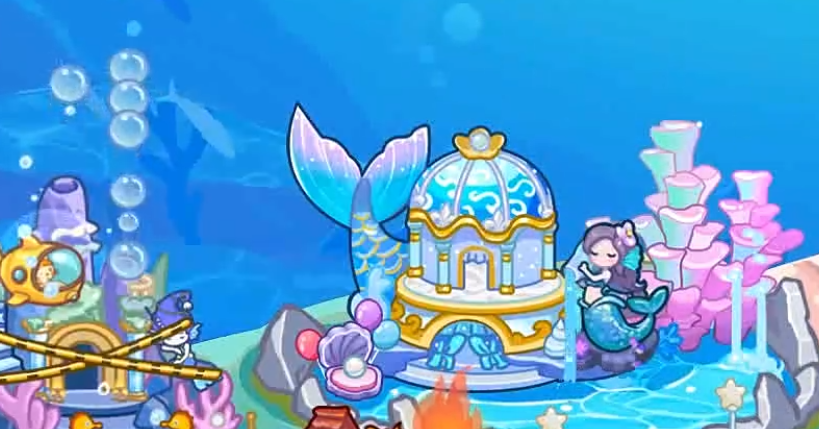场景中设置有秋千、散落道具等可交互元素,角色靠近即可触发游玩或拾取行为。地图采用横向卷轴式展开结构,鼓励玩家主动移动探索全景画面。当前版本中,“人鱼海湾”为最具代表性的大型主题地图:其结构分为上下两层,上层“浮岛”区域开放钓鱼玩法,用于采集基础资源;下潜后抵达“奇幻海洋公园”,开启水下探索支线。该区域分布多位NPC美人鱼及海洋生物,与其成功互动可激活隐藏任务,完成后奖励与所在场景强关联,提升内容沉浸感。