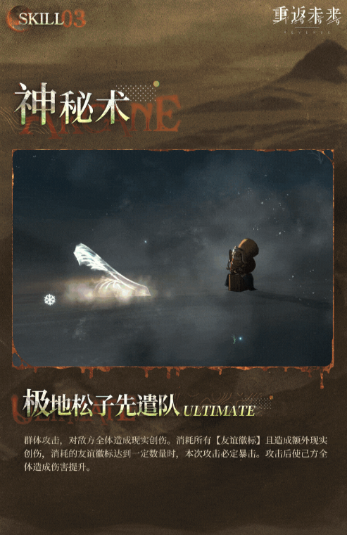 嚼嚼松果的大招技能为“极地松子先遣队”,可以对敌方的群体目标,造成一次aoe现实创伤,该技能会根据嚼嚼松果,获取得友谊徽标数额,进行伤害翻倍,也是嚼嚼松果一个重要的伤害技能,同时该技能被友谊徽标加持后,必定会对敌方造成一次暴击。