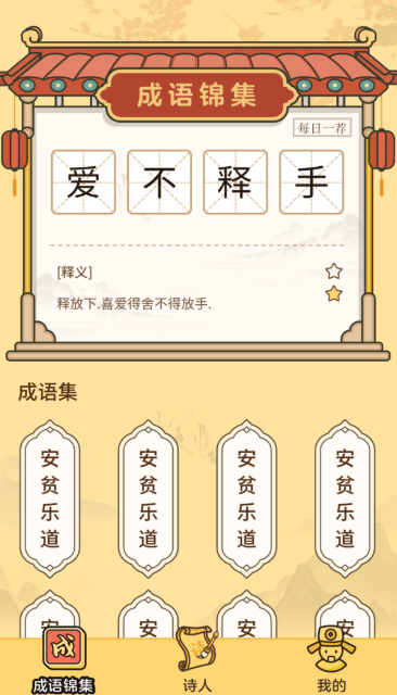 手游不仅让你在精美的古风画面中享受视觉盛宴,更通过互动式的学习方式,让你在游戏中深入理解每一个成语的由来和意义。游戏设计了多种玩法,如限时挑战,让你实现成语积累;还有“生词本”功能,帮助你记录并复习新学到的成语,确保知识点的巩固。