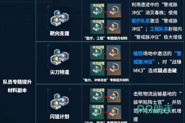 深红武装副本则是武器强化体系的重要来源,主要掉落武器兑换币、模组数据单元以及活性合金锻料。前两项用于武器更换与模组主属性刷新,后者为工程类职业专精升级所必需。若计划打造高输出队伍或培养医疗支援型角色,该副本建议每日刷满。此外,职业专属材料副本也需重点关注。靶向支援副本按职业划分产出,仅提供影刃与冲锋突击两个职业的专精素材,因此务必根据自身主力职业选择对应副本,避免无效投入。