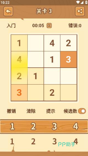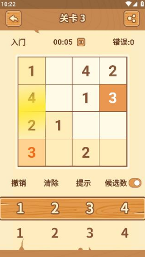 这是一款数字闯关类游戏,它拥有海量充满挑战的数独谜题关卡。这些关卡的难易程度各不相同,新手玩家可以先学习一些解题技巧,从最简单的关卡入手,逐步积累游戏经验,最终顺利通关。在进行数独谜题挑战时,玩家能够自由选择四宫格或六宫格来开启挑战。新手玩家可以根据自身实际情况,挑选适合自己挑战难度的关卡。玩家每成功通过一关数独谜题,都能在游戏界面看到对应的闯关时间和得分。