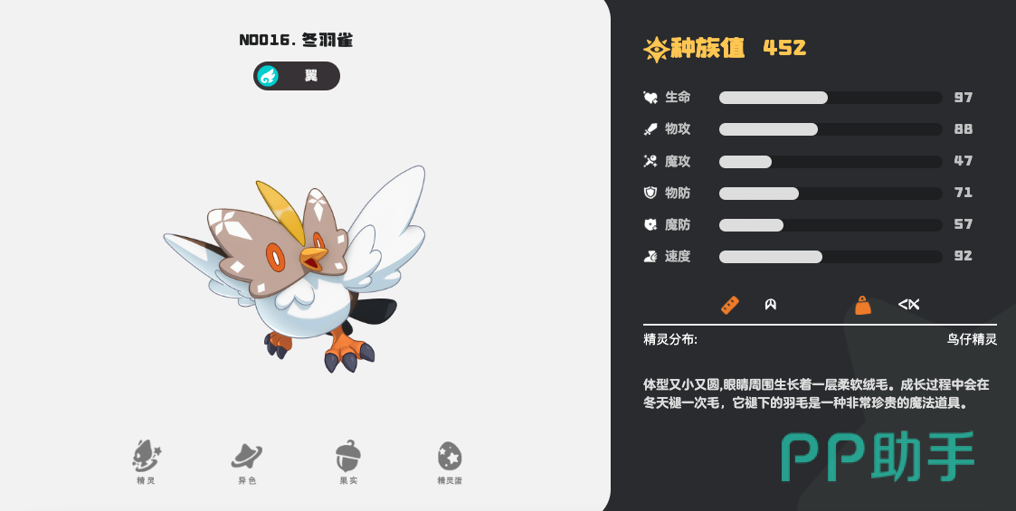 冬羽雀是玩家进入《洛克王国世界》后最早可获得的初始精灵之一,隶属翼系,外观清新灵动,动作轻盈迅捷,完美还原了雀羽“空中压制、先手制敌”的核心体验。更富巧思的是,其形象会随游戏内春、夏、秋、冬四季轮转而动态变化,形成独特的视觉彩蛋。作为御三家体系中的代表性翼系伙伴,它虽非后期高阶PVE/PVP主力,却以均衡的基础属性成长曲线与稳定的前期适配性,成为新手过渡与日常探索阶段的重要战力支撑。