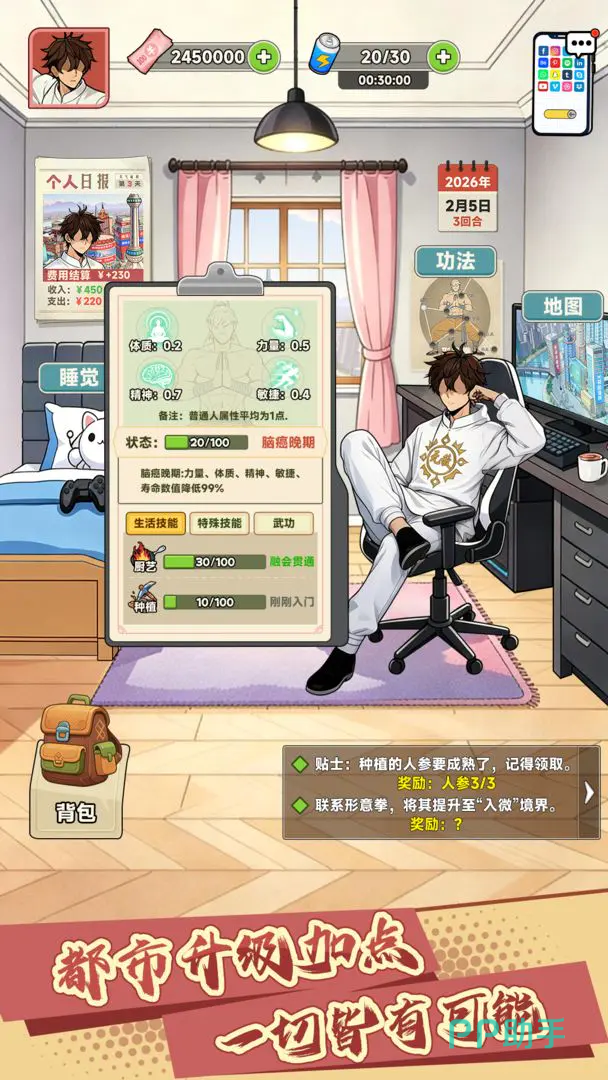 游戏构建于高度写实的当代都市语境中,玩家初始身份为无特殊能力的普通市民,通过持续投入时间与策略选择,在职场晋升、功法修习、艺术精进、格斗训练等多维路径中逐步突破人体极限。终极成长目标明确:肉身突破音速阈值、躯干抗毁能力达核爆级强度,并肩负匡扶正义、肃清都市阴暗面的核心使命。