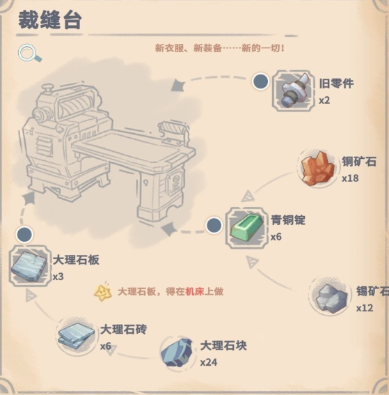 需特别注意:驼牛站并非直接建造,而是存在明确前置依赖——必须先制作“裁缝台”。该工作台是解锁驼牛站蓝图的关键节点。裁缝台所需材料为:旧零件×2、青铜锭×6、遗迹大理石板×3。其中,旧零件与青铜锭可通过常规探索、矿脉采集及基础冶炼获得;遗迹大理石板则仅产出于特定遗迹场景,如“回收公司遗迹”,建议玩家在角色战力提升至Lv.12以上、携带足够恢复道具后再深入探索,以应对遗迹内高威胁等级的守卫单位。