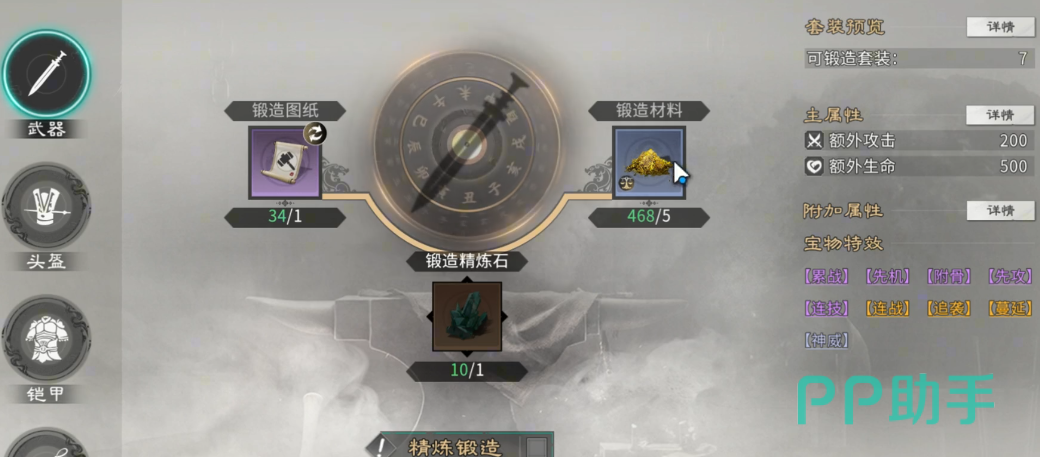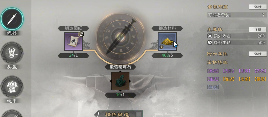 装备获取主要依托锻造系统,分为普通锻造与精炼锻造两种模式。普通锻造需消耗对应图纸、基础材料及银币;精炼锻造则额外要求精炼石,用于提升装备品质上限。图纸类型决定产出范围:使用普通图纸有概率触发稀有套装解锁,而指定武器(如龙泉宝剑)必须匹配专属图纸方可稳定打造。值得注意的是,龙泉宝剑并非某位武将的限定专属武器,其图纸获取门槛较低,泛用性强,常被用于后期高阶专属武器升星时的材料转化(俗称“狗粮”)。