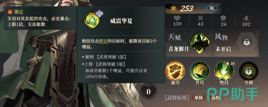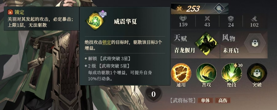 威震华夏是他突破达到一定条件之后可以用的技能,只要绝技攻击锁定目标时,就能驱散该目标的3个增益效果,而且在2级武将突破5星时,每成功驱散1个增益之后,关羽还能额外获得自身10%的行动条提升。这种能力不仅削弱了敌人,也为关羽提供了更多的出手机会,此外这个技能带来的效果当中,关羽还具备一种独特的锁定效果,当他对敌方发起攻击时,这次攻击必定会暴击,增加了伤害输出。这种锁定效果上限只有1层,且无法被驱散,保证了关羽在关键时刻的爆发能力。