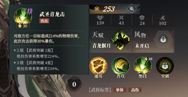 他的普攻名为青龙,能够对敌方前排目标造成100%的物理伤害,绝技输出的时候它可以堆积针对对面的一个角色,然后造成214%的物理伤害,并且此次攻击还能获得30%的暴伤加成,当关羽突破至2级武将突破2星时,绝技的伤害系数会进一步提升至224%,而在3级武将突破4星时,这一系数更是高达234%。这样的伤害提升使得关羽在战场上的威胁力大增。