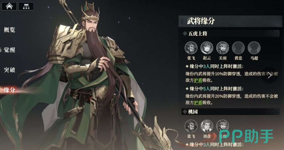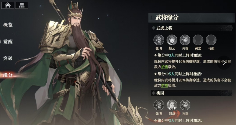 除了个人天赋外关羽的武将缘分也非常丰富,他与张飞、黄忠、赵云、马超共同组成了五虎上将的羁绊当,其中3人同时上阵时,缘分内的武将将获得10%的防御穿透,这意味着他们的攻击可以无视敌方护盾,直接对敌方造成伤害,而当5人同时上阵时,这一效果将提升至20%,此外关羽还与张飞、刘备有着桃园缘分羁绊,当这三人同时上阵时,如果任一武将被击败,其他同缘分武将将获得10%的攻击力提升和50%的行动条提升。