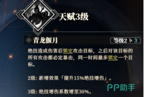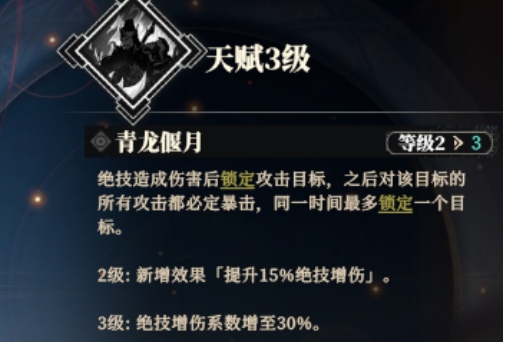关羽的天赋名为青龙偃月,这一独特的天赋使得他在绝技造成伤害后能够锁定目标,随后对该目标的所有攻击都会变成暴击,这种天赋不仅提升了关羽的输出能力,还使得他在面对单个敌人时更加致命,觉醒天赋后关羽的绝技系数还能得到最多30%的提升,进一步增强了他的培养潜力,从这样的特点来看,关羽显然定位为单体高伤武将,他的绝技倍率极高,而且可以通过天赋获得进一步强化,在2级武将觉醒天赋升级时,关羽将获得额外的效果,就是提升15%绝技增伤,而在3级武将觉醒天赋升级时,绝技增伤系数将增加到30%,这样的设计使得关羽在战斗中能够迅速削减敌方核心单位的生命值。