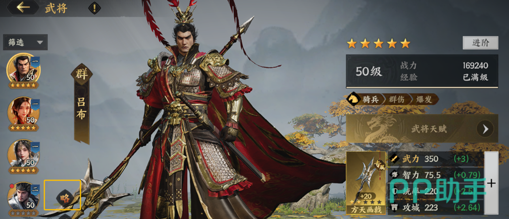 在《三国群英传:策定九州》中,吕布被设定为高爆发的骑兵突击型武将,属于全游戏最强单体输出单位之一。其角色设计高度还原了“人中吕布,马中赤兔”的传奇形象,具备全阵营最高的攻击成长值和卓越的战场机动性。相较于其他骑兵角色,吕布不仅拥有瞬间斩杀敌方关键目标的能力,还能持续施压,保持长时间的作战优势。从属性成长来看,吕布的攻击力成长系数位居所有武将之首。实测数据显示,当吕布升至90级并达到红色品质时,基础攻击力可达4580点,相比同等级的关羽高出约15%,较张飞更是领先近20%。