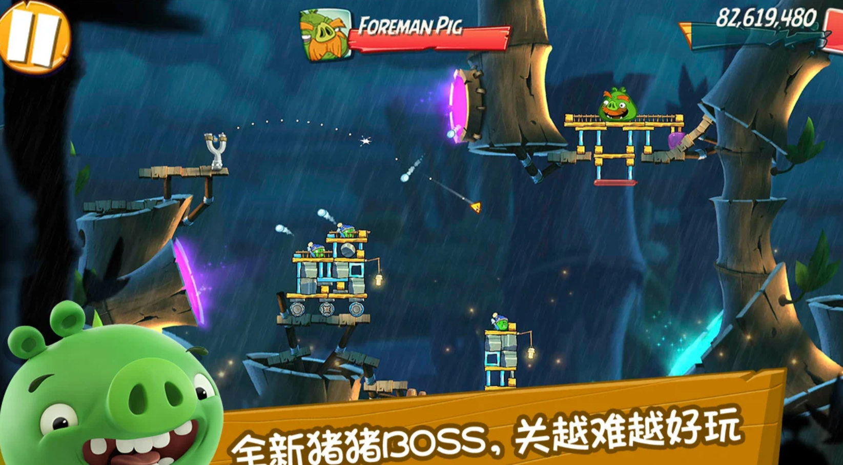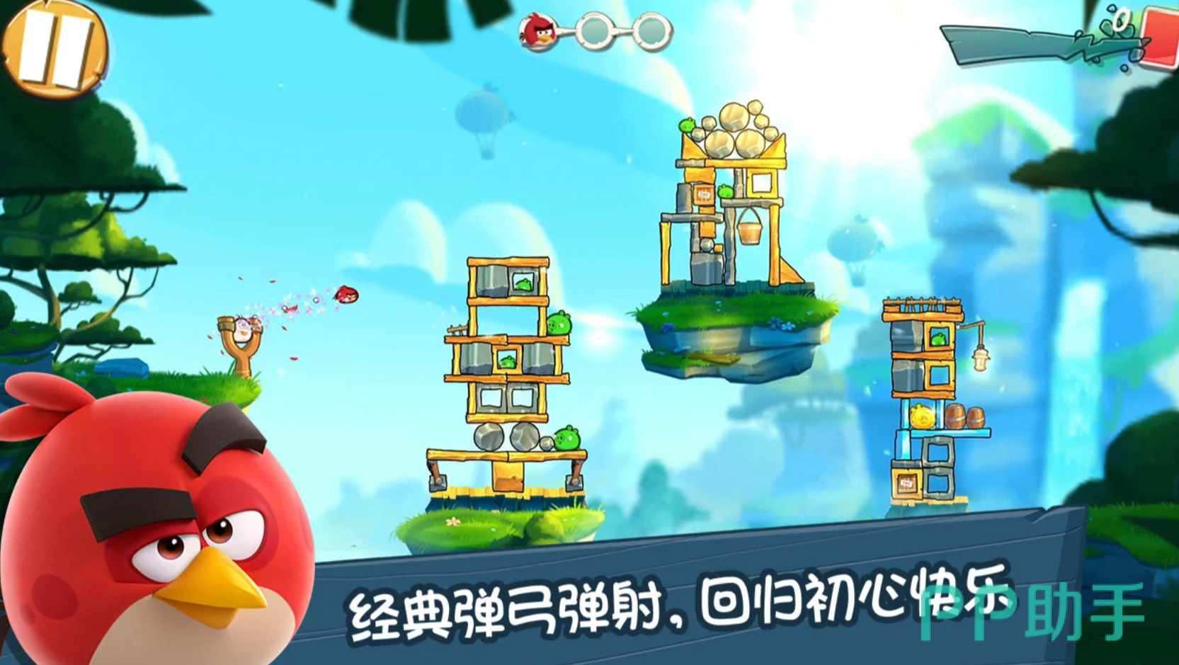 游戏延续系列标志性玩法:将小鸟置于弹弓之上,拖拽调整发射角度与力度,松手后精准命中掩体后的绿皮猪。操作直观易懂,但通关并非靠随机尝试——建筑结构、材料物理特性、小鸟技能特性三者深度耦合,构成层层递进的解谜体验。