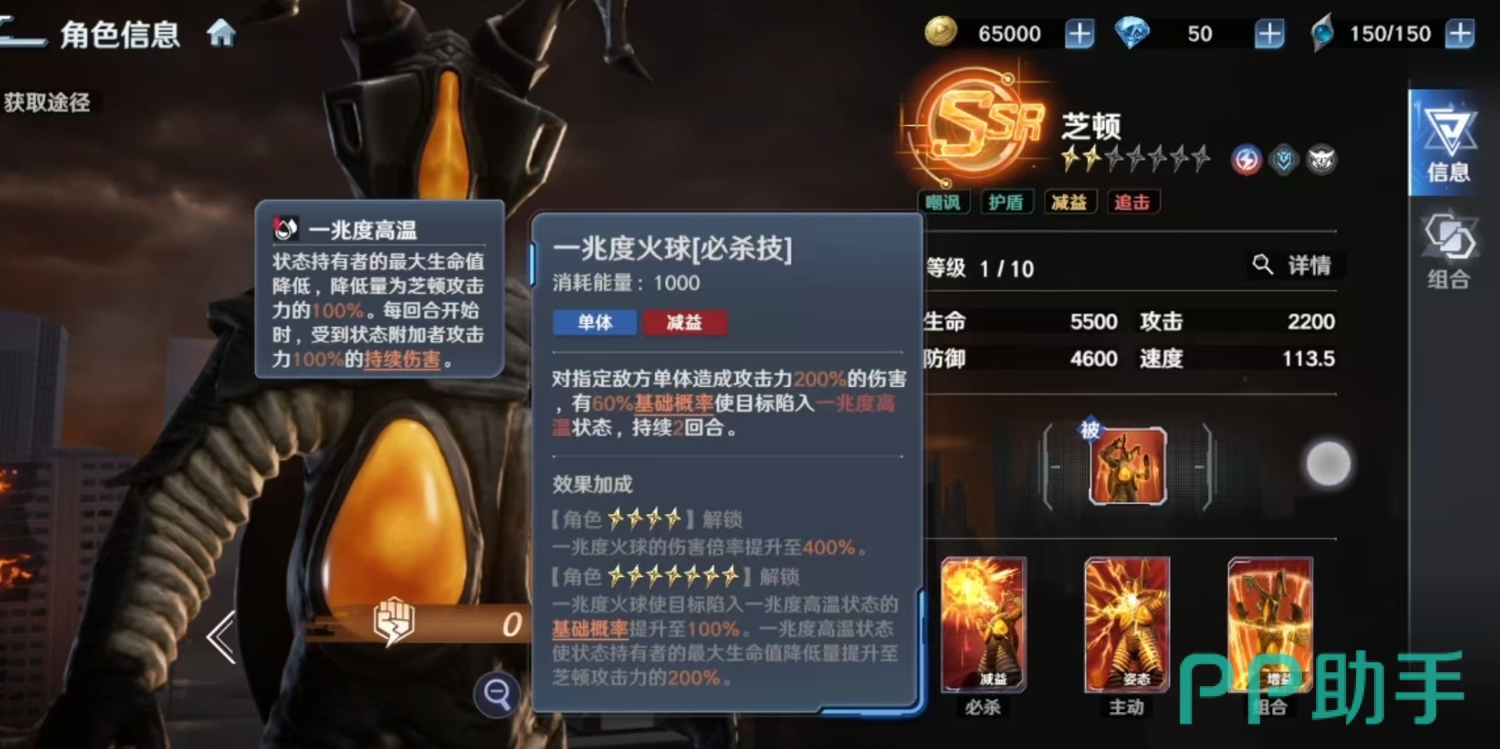 主动技能【终结光线】可对单体敌人造成高额伤害,并附带“1兆度高温”状态,持续两回合。处于该状态的目标,最大生命值将被永久削减(不可驱散),且每回合初额外承受一次基于其当前生命上限的百分比伤害。结合被动产生的多段持续伤害,芝顿在中后期能形成稳定的复合型DOT压制体系。