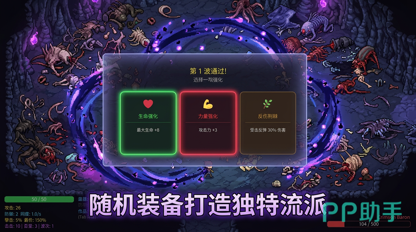 每轮怪物清剿完成后,系统提供三项不可叠加的强化选项:生命强化(最大生命+8)、力量强化(攻击力+3)、反伤荆棘(受击反弹30%伤害)。选择结果直接影响后续战局走向——合理预判敌人类型,针对性提升克制属性,是通关高难波次的关键策略。