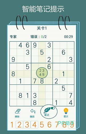 这是一款锻炼逻辑智力的游戏,它在传统数独游戏玩法的基础上进行了演变。游戏里有多达800个关卡,还设置了四种不同的难度等级,分别是普通和中等还有困难和专家,每个难度都有不一样的挑战难度。玩家还能在游戏里调整屏幕亮点和背景颜色和字体大小,充分考虑到了不同年龄段玩家的各种需求。游戏中玩家可以根据提示算出对应的随机题目,自由数独的玩法十分有趣,依据提示得出相应答案。