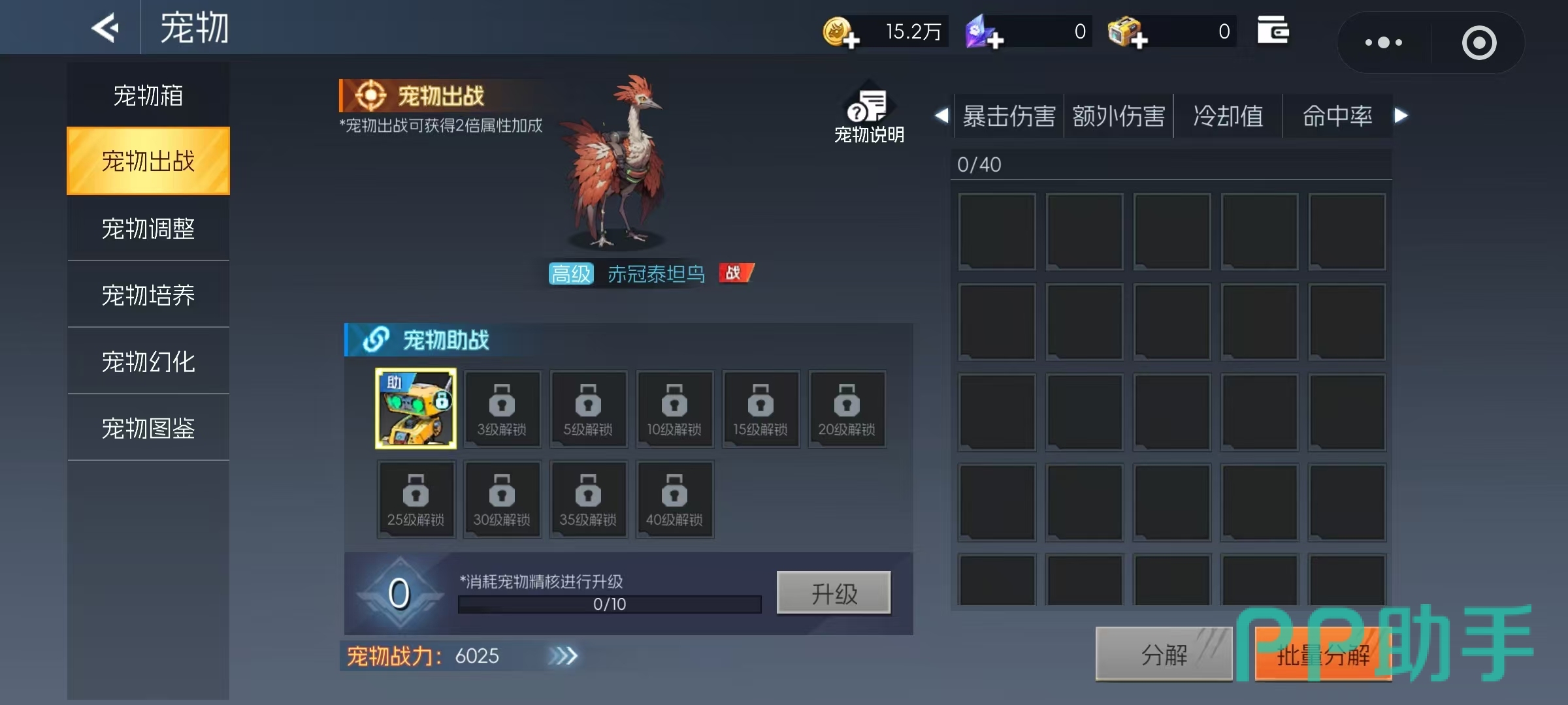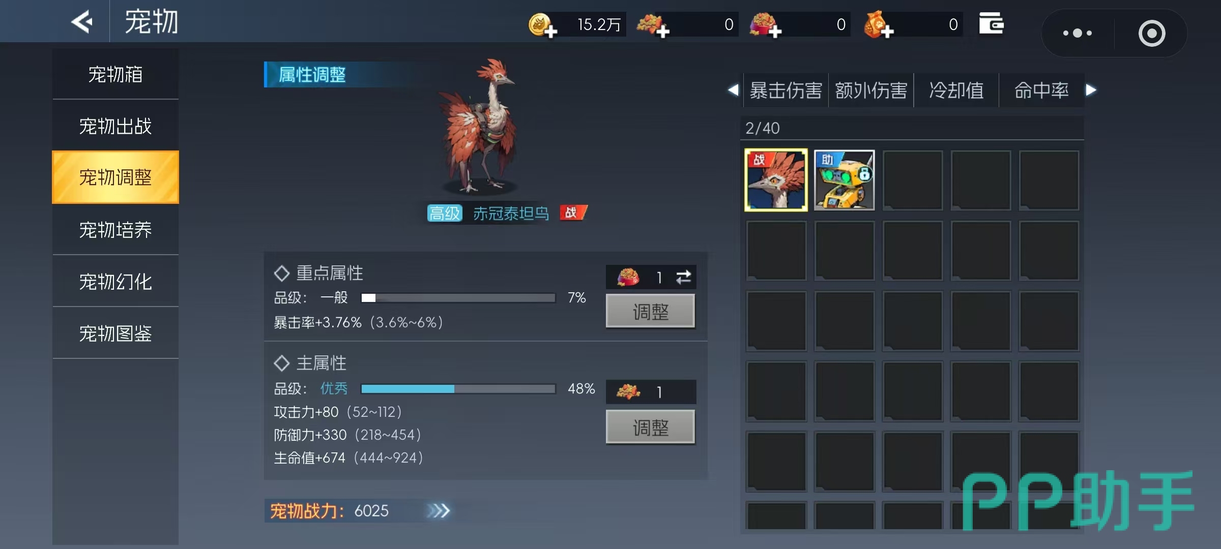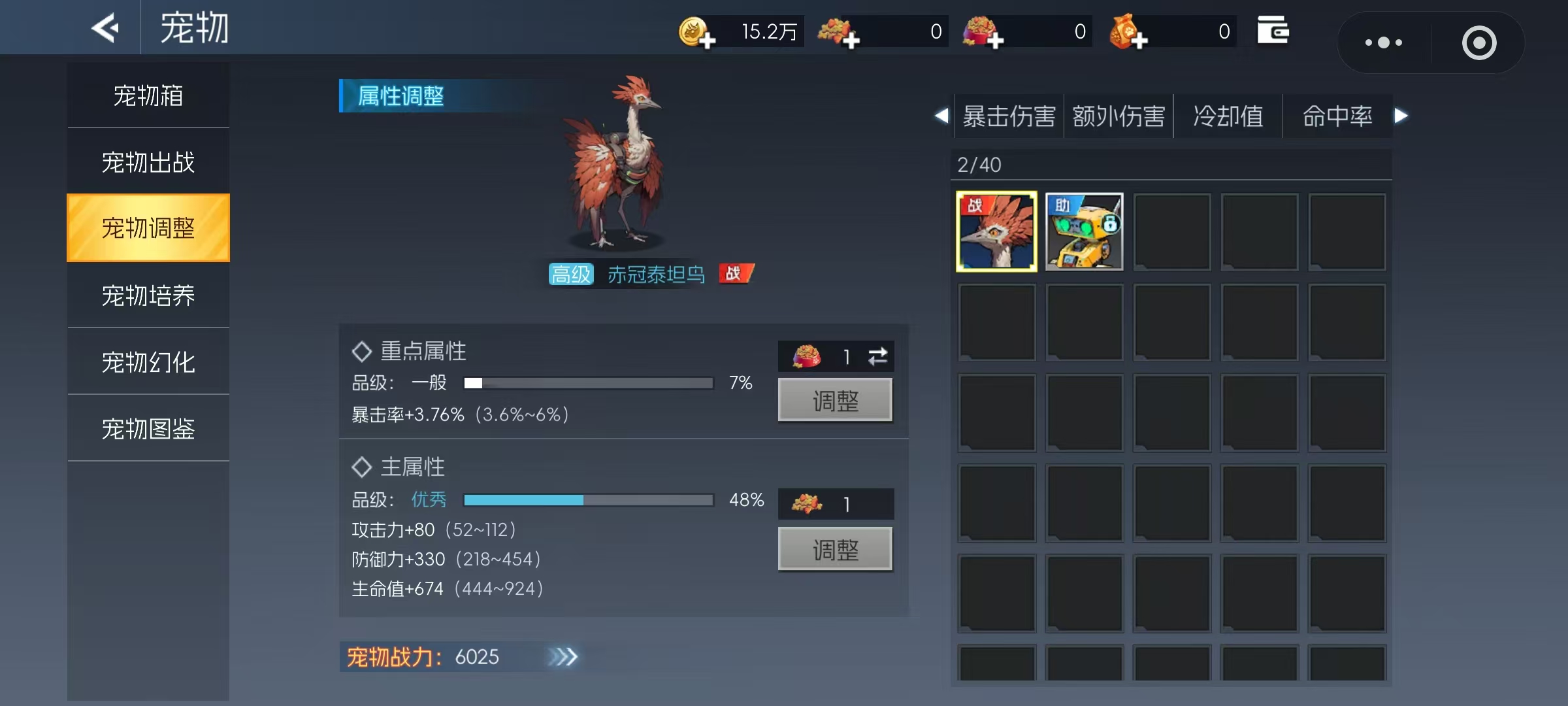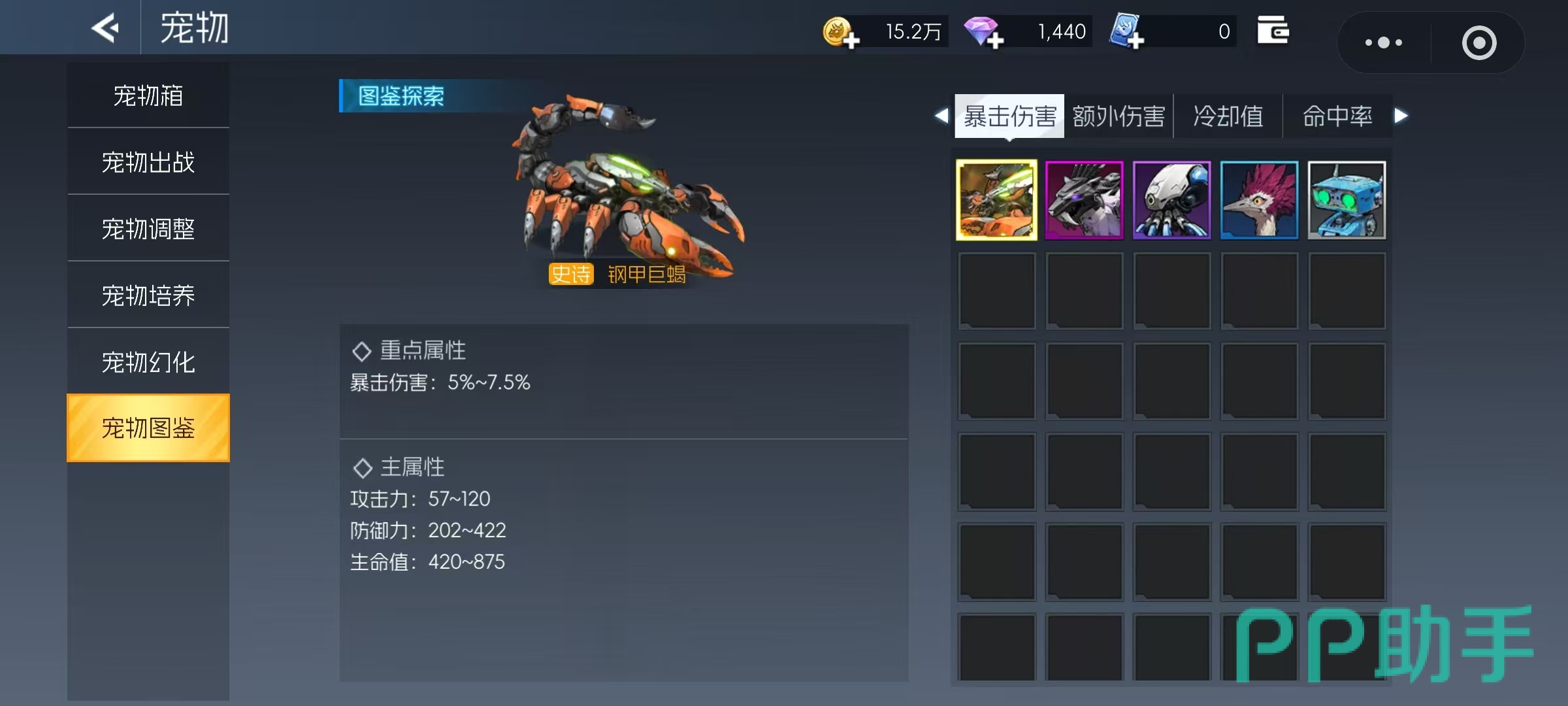 若当前宠物所附带的属性不符合职业需求,可点击“宠物调整”功能重新配置属性分配,力求匹配角色的职业特性与战斗风格。选择宠物时应结合自身职业特点进行判断。宠物按核心增益方向可分为暴击率、暴击伤害、额外伤害、冷却缩减和命中率五大类型。对于技能释放频率较高的职业,推荐选择提供冷却缩减加成的宠物;而对于命中稳定性不足的职业,则更适合配备提升命中率的宠物。总体而言,暴击与暴击伤害仍是大多数职业最具性价比的选择,能有效提升整体输出能力。推荐使用的宠物包括钢甲巨蝎、钢牙剑齿虎等高实用性单位。