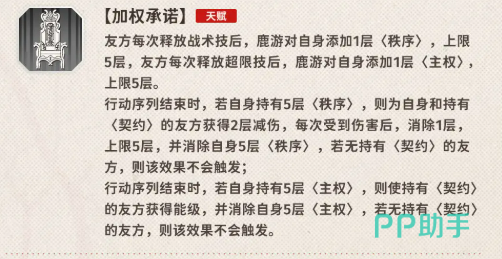 鹿游的天赋“加权承诺”则进一步强化了她在战斗中的资源管理能力。每当友方释放战术技或超限技,鹿游就会获得相应的“秩序”或“主权”层数。当她的“秩序”层数达到5时,不仅能为自己和持有“契约”的队友提供减伤效果,还能消耗这些层数触发额外的增益效果。而当她的“主权”层数达到5时,她则会为持有“契约”的队友提供能级支持,进一步增强队伍的整体输出能力。这些机制让鹿游在战斗中充当了资源管理与支援的双重角色,她不仅能增强队友的伤害输出,还能提供战术上的灵活性。