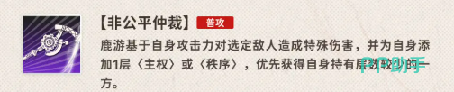 鹿游的普攻技能“非公平仲裁”在战斗中的表现非常特殊。每次普攻,鹿游会根据自己当前持有的“主权”或“秩序”层数,为自己添加相应的状态效果。简单来说,这个技能不仅是她的输出来源之一,还能根据战局的变化,灵活调整她的状态。这意味着,在每次行动中,她都能根据实际情况获得最合适的增益,确保自己在战斗中的持续输出与生存能力。