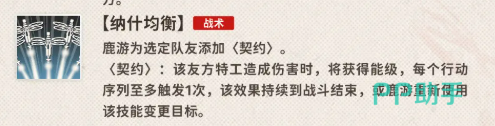 她的战术技能“纳什均衡”则是她与队友合作的关键技能。通过为队友添加“契约”效果,每当这些队友造成伤害时,都会获得能级。这一效果每个行动序列触发一次,并且持续到战斗结束或技能重新使用。这使得鹿游能够有效提升队友的输出能力,并为全队提供能级支持,确保在关键时刻能够触发技能和超限技。