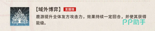 最后,鹿游的支援技能“域外博弈”也不可忽视。她能够提升全体队友的攻击力,并为队友提供能级,这不仅能在关键时刻提升队伍整体输出,还能确保队伍始终保持高效的能级运作。她的支援能力让她在战斗中充当了一个灵活的辅助角色,既能为队友提供强大的增益,又能在紧要关头提供关键的能级补充。