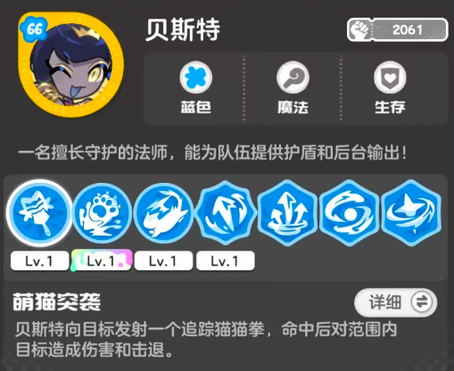 另一名适合新手过渡的角色是贝斯特,定位为守护型法师,归属蓝色系。其技能机制围绕护盾生成与后台持续输出展开,每次施法均可为全体队友叠加蓝色护盾,实现全程承伤减免;同时具备地图标记位移能力,便于在战斗中灵活调整站位,兼顾生存保障与战术机动性,大幅提升队伍容错率。