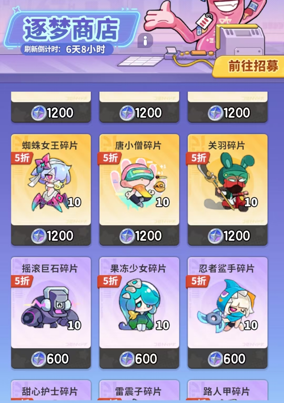 除星铸之旅外,“招募积分”系统同样支持永久梦灵获取。该积分随梦灵招募卡池抽卡次数同步累积,不设有效期,可随时在逐梦商店中兑换指定梦灵。商店内按品质划分兑换档位:传说梦灵、史诗梦灵与稀有梦灵所需积分各不相同。其中,传说梦灵享有专属折扣机制——每位梦灵每周前三次兑换均享5折优惠,单次仅需1200积分兑换10碎片;超出三次后恢复全价,单次需2400积分。若玩家计划一次性合成完整传说梦灵(共需70碎片),最低积分消耗为8400点;但若采用分周策略,即每周仅兑换三次折扣额度,并等待次周优惠重置,则总计仅需6000积分即可达成目标。
