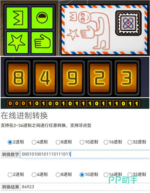 开启“人物卡2”信封,其内容可辅助解开“人物卡7”图案谜题,获得“火柴”。用“火柴”点燃“人物卡6”煤油灯。将“人物卡8”显示的二进制数值转换为十进制,得出“人物卡5”锁具密码:84923,输入后获得“硬币”。