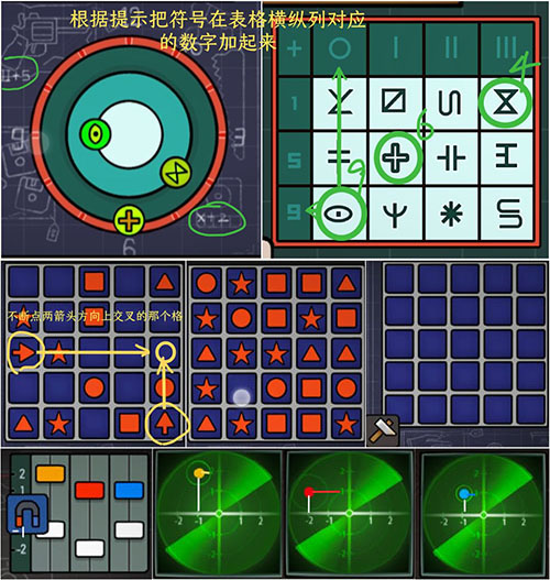 场景中浮现带有“人物卡5”图标的机械时钟,完成其时间逻辑谜题后,获得“人物卡6”。紧接着进行5×5蓝色格子排列挑战,胜利奖励为“铁锤”。使用“铁锤”击碎“人4”外层石膏,取出内部“磁盘”。将“磁盘”插入“人3”电视接口,结合“人6”雷达界面显示的方位提示,破解“人2”区域黄红双色坐标谜题,获得“磁铁”。