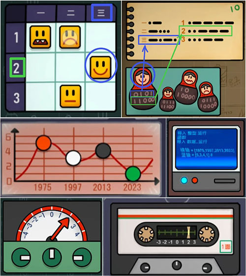 依据“人物卡7”套娃结构与摩斯电码提示,推导出“人物卡8”表情坐标含义,从而获取“阀门”。再结合“人物卡3”提供的数值关系,解出“人物卡5”统计表答案;并参考此前插入电视的“磁盘”所播放音频线索,定位“人物卡8”表盘密码。