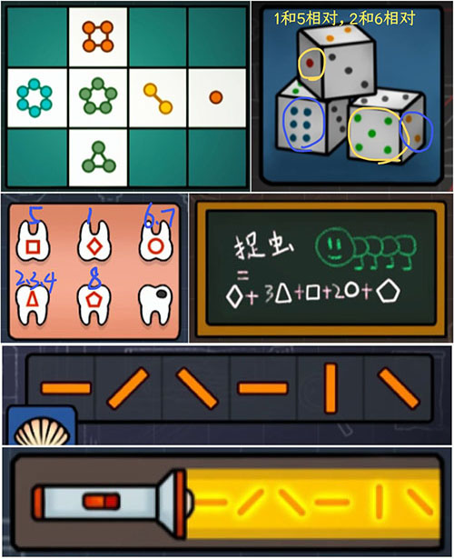 筛子平铺展开后构成新谜面,解出后获取“黑板擦”。用其清洁“人物卡6”所附黑板区域,显现出“人物卡3”牙齿图案线索,并同步获得“放大镜”。借助“放大镜”聚焦观察“人物卡5”右下角符号板,破译其图形密码,取得“贝壳”。