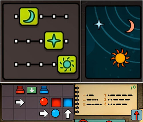 解开“人6”日月星三重天体运行谜题,获得“小刀”与“人物卡7”。参与进球类弹道控制小游戏,赢得“指针”。用“小刀”剖开先前取得的“苹果”,显露隐藏的“人物卡8”。将“指针”装配至表盘结构,完成校准动作。