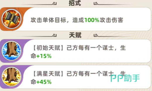 墨子的核心机制围绕“谋士数量→生命值增益”的联动逻辑展开。初始天赋即生效:每上阵1名己方谋士,墨子自身最大生命值提升15%。该设定精准补足谋士职业普遍偏脆的短板——在强化输出的同时,通过墨子构建起整支谋士队伍的承伤基底。随着阵容中谋士数量增加,其生存容错率呈阶梯式上升,使团队具备持续作战的基础条件。