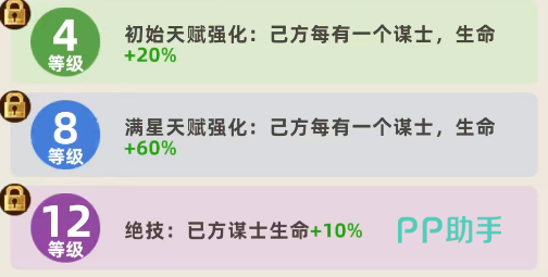 抵达12级后,墨子解锁终极技能——为全体己方谋士提供1%最大生命值加成。该效果与前期仅作用于自身的天赋形成互补:前期聚焦个体生存强化,后期转向全局赋能。所有谋士的生命增益可叠加生效,使整支队伍在血量维度获得系统性强化,大幅提升持久战能力与容错空间。