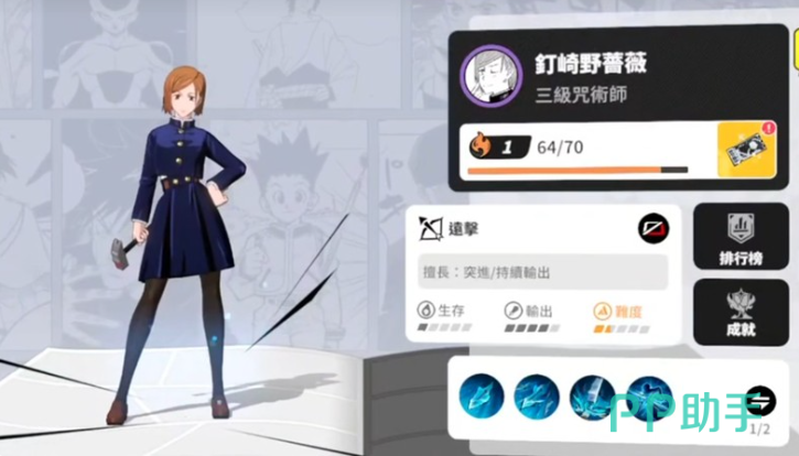 钉崎野蔷薇同样是射手阵营中的代表角色,她的普攻极具特色,会向着前方扇形区域一次性发射出三颗尖锐的钉子,每颗钉子都能准确地命中敌人,造成伤害的同时,还会附加一层特殊的负面效果,随着普攻不断地命中敌人,这些负面效果会逐渐叠加,经过一段时间后会自动引爆,根据层数的不同,造成的伤害也各不相同,她的咒力冲刺技能让她能够朝着前方快速冲刺一段距离,迅速拉近与敌人的距离或是调整自己的站位,而共鸣技能是会向前方发射一颗钉子,一旦成功命中目标,便会在敌我之间生成一个诡异的巫毒娃娃,将双方属性相连,此后她对娃娃造成的伤害以及被动叠层的效果都会直接传递给被连接的目标,并且中招的敌人还会受到持续3秒的减速效果。