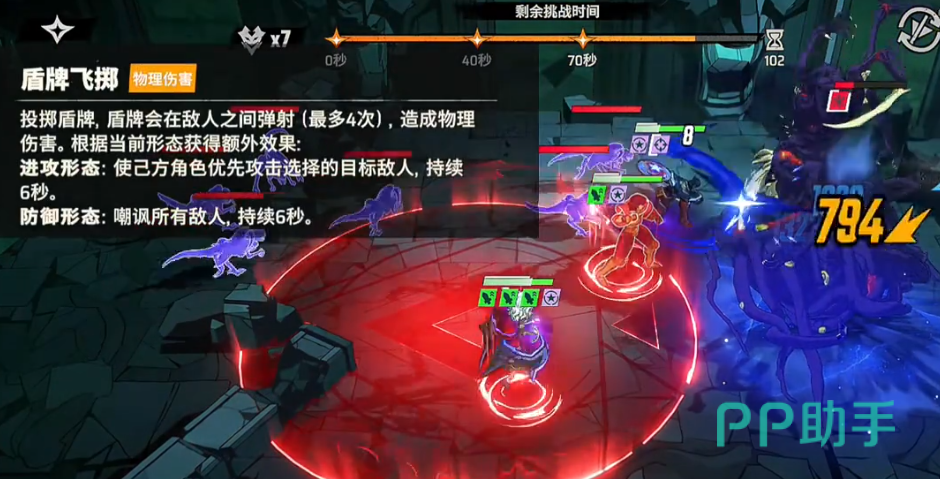 美国队长的主动技能“盾牌飞掷”具有弹射机制,最多可在敌人之间跳跃4次,每次命中均造成物理伤害。依据当前所处形态,该技能还将附加不同增益:进攻形态下,目标将受到二次打击;防御形态则触发群体嘲讽,强制所有敌方单位攻击美国队长,持续时间长达6秒,极大提升了后排安全性。