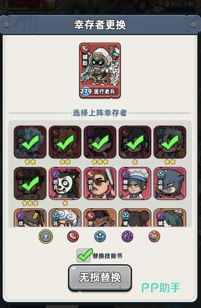 角色更换操作共分三步:第一步,进入主界面后点击底部导航栏中的“幸存者”入口;第二步,在幸存者管理页下滑至页面底端,点击“布阵”按钮,进入阵容编辑界面;第三步,在当前出战阵容中,点击任一已上阵角色头像(例如医疗老兵),系统将自动跳转至角色替换面板。