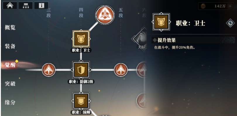 觉醒系统跟职业系统也有关,升级到一定的程度大家就可以看到转职,并且玩家可以花费玄龙珠去解锁上下两个分支的职业,后续当武将达到十段时,进阶职业也能够进行升级。基础职业最多可以升至3级,而进阶职业目前只能升至2级,职业升级后会带来更多的效果,以孙开朗为例,基础防御职业原本可以为同列队友分摊伤害,升级后不仅能够继续分摊伤害,还可以减免部分分摊过来的伤害,而卫士职业可以有效提升单体的坦度。