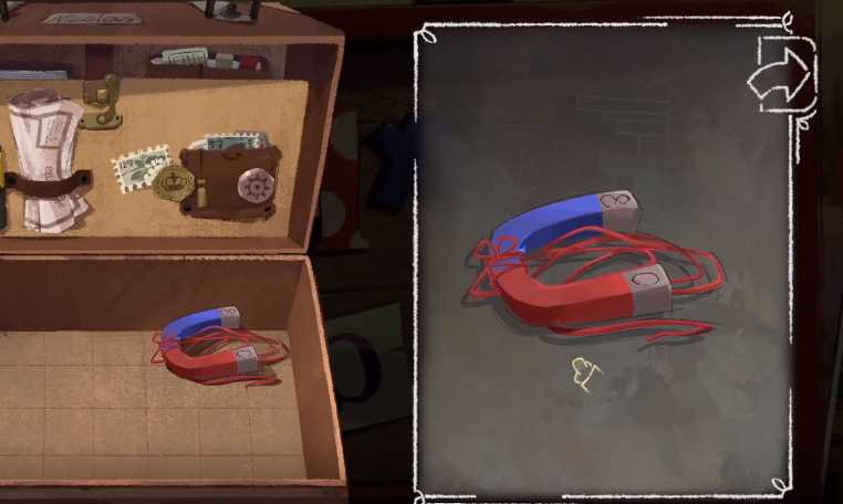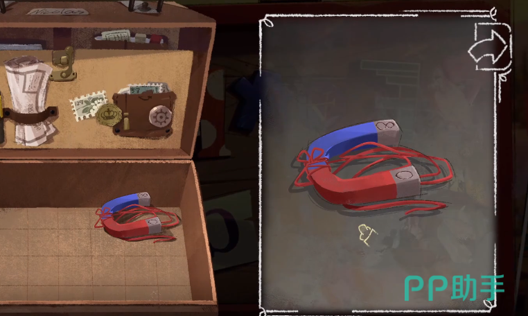 完成这一关的考验非常简单,并且通过这一关的任务,玩家也能了解到游戏里的道具可以进行组合,同时也可以在选中之后进行拆分,打开道具箱,选中道具之后,右侧会有几个按钮,如果点击第一个按钮,玩家可以把两个选中的道具结合起来,前提是这两个道具的具的是对后续有帮助的,点击第二个按钮,可以把两个曾经组合过的道具拆分开,第三个按钮则是可以让玩家详细的查看这个道具上的线索。
