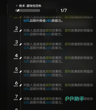 该武器以“意志强化”为底层驱动,通过三维属性的阶梯式成长构建稳定输出基底:主属性由初始10点线性提升至满级90点,全程支撑技能伤害转化效率;自然伤害加成初始为60%,随攻击次数递减至50%,确保高频打击下的持续压制力。其核心技能“腐蚀性狂热”具备双重战略功能——不仅延长腐蚀状态持续时间50%,还可叠加最高43%的敌方防御削减效果,显著放大全队自然系干员的破防收益。