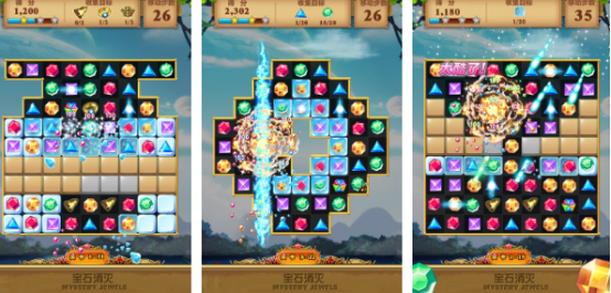 大量非常炫酷又精彩的宝石融入其中超多特色关卡,长时间体验也不会觉得过于厌烦。只要匹配三个或者以上相同颜色宝石即可快速消除,有不同的道具生成模式,包括横向消除,纵向消除以及魔法消除等等。另外又加入炸弹系统,在关键时刻可以使用。随着关卡逐渐升级,难度也有所增加。