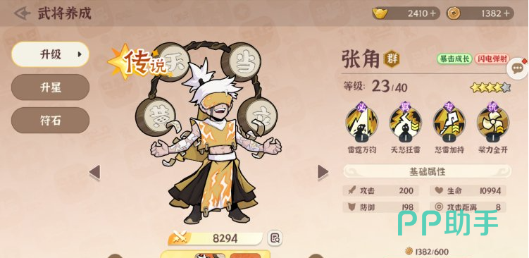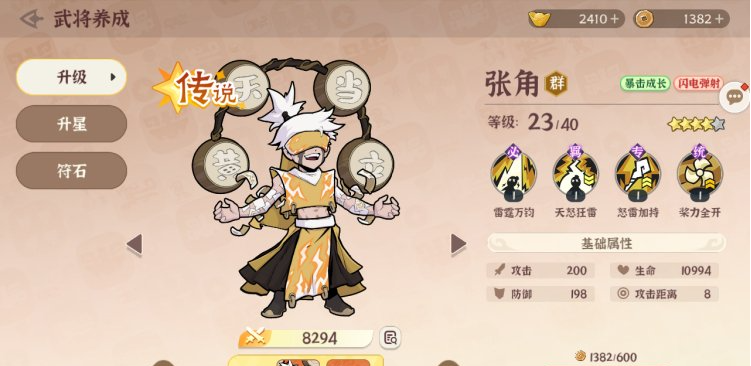 张角是一名高爆发法师,凭借暴击成长优势和连锁闪电特性,在清场和斩杀阶段表现出色。二技能“雷霆万钧”可锁定敌方血量最低的3名单位造成960%伤害,且每多一名己方存活角色,技能额外增加一个目标。三技能“天怒狂雷”冷却时间为20秒,对距离最近的敌人造成500%攻击力伤害,并为自己叠加10%增伤效果。四技能“怒雷加持”每累计击杀15个敌人后触发,永久提升自身10%攻击力。被动技能“桨力全开”提供全局金币产出+3%,助力资源积累。