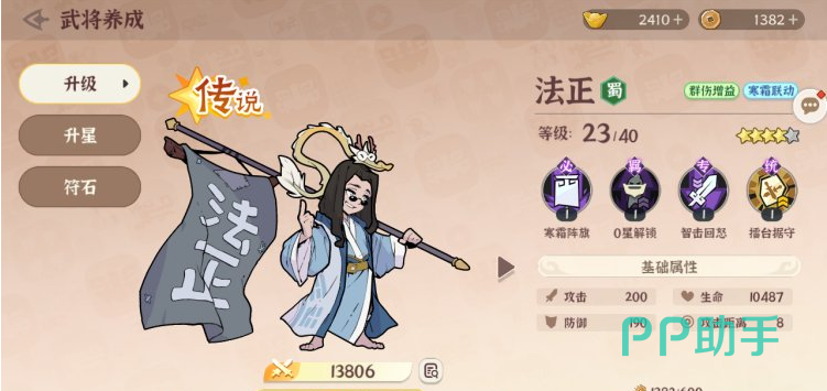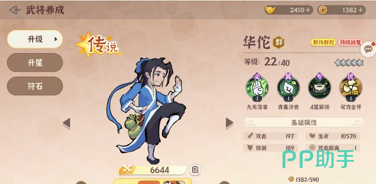 作为传说级别的辅助武将,华佗集治疗、控制与自保于一体,团队适配性极强。一技能“九天落掌”需积攒1000怒气释放,短暂蓄力后跃起下砸,对以敌方为中心、半径2格范围内的目标造成800%伤害。二技能“青囊济世”每完成10次普通攻击即可发动,恢复自身15%最大生命值。三技能“悬壶守御”在累计消灭15个敌人后触发,永久提升15%防御力。此外,其被动同样带来3%的全局金币产出加成。