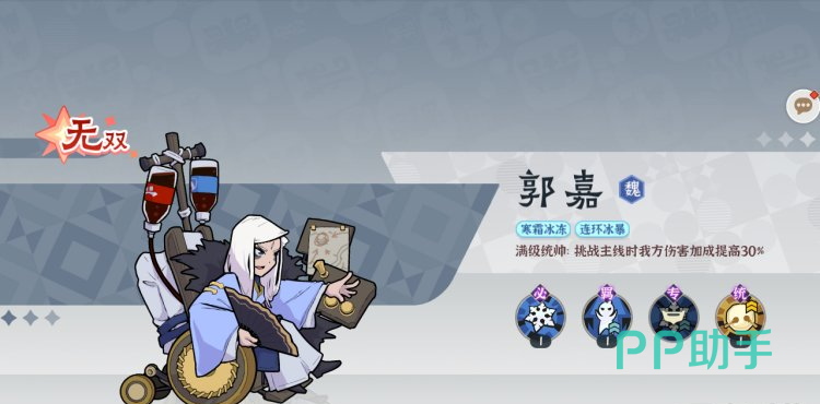 郭嘉主攻冰系控制与范围输出,擅长利用“寒霜”状态形成连环冻结效应。一技能“冰封千里”在怒气满时释放,对12×5矩形区域内的敌军造成550%范围伤害,并有50%概率施加“寒霜”状态。二技能“奇策增伤”在释放必杀技后自动触发,提供持续20秒的10%增伤效果。三技能“寒袭怒涌”当任意敌人被附加寒霜时,20%概率回复自身40点怒气,加快技能循环。四技能“主线冲锋”专用于主线关卡挑战,提升全队2%伤害,非常适合前期推图使用。