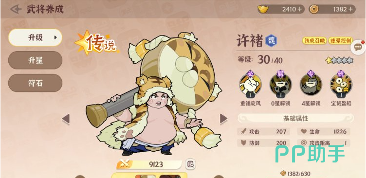 作为前排坦克代表,许褚具备出色的承伤与控场双重能力,能够稳定保护后排输出单位。一技能“重锤旋风”在怒气满后激活,对周围1格范围内的敌军每0.4秒造成60%伤害,并有10%几率附加眩晕效果,打断对手关键技能。二技能“饮血狂战”在受到攻击时30%概率发动,使自身成为中心点,在接下来的10秒内提升范围内2格所有友军10%攻击速度。三技能“铁壁防御”由全队普攻次数累积触发,每累计50次普攻可强化自身30%防御力。四技能“宝货盈船”则为非战斗增益,提升渔场铜钱收益3%。