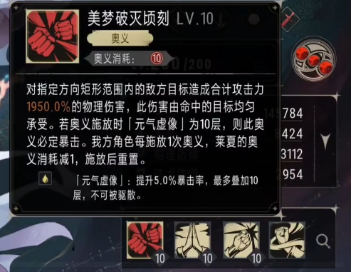 而且在特定的战斗阶段,莱夏的暴击率提升效果十分可观,这是由特性和战技共同作用的结果,特性本身赋予了莱夏一定的暴击率加成,而战技在此基础上进一步增加了暴击率,两者相加使得莱夏在单体输出方面能够爆发出极高的伤害,莱夏的奥义技能美梦破灭顷刻具有强大的杀伤力,当她释放该技能时,会对指定方向矩型范围内的目标造成总计1950%攻击力的物理伤害,而且这个伤害会由命中的所有目标均匀承受,更为关键的是,如果莱夏在释放此奥义技能时,自身的元气虚像已经成功叠加到了10层,那么此次攻击必定会出现暴击效果。