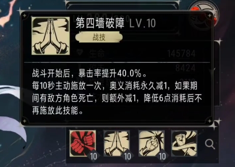 除了普攻特性外,莱夏的战技第四墙破障同样威力惊人,使用战技的时候莱夏可以进入一种超凡的战斗状态,此时他的暴击率瞬间直接提升40%,而且这种状态并非昙花一现,每隔10秒钟,他就会主动释放一次这一技能,不仅如此莱夏的奥义技能消耗也会随着战斗进程逐渐降低,具体来说就是只要有敌方角色在战斗中死亡,他的奥义消耗就会额外再降低一点,当降低到 6点消耗之后,这一技能便会进入一个新的阶段,此时就可以等待致命一击的最佳时机。
