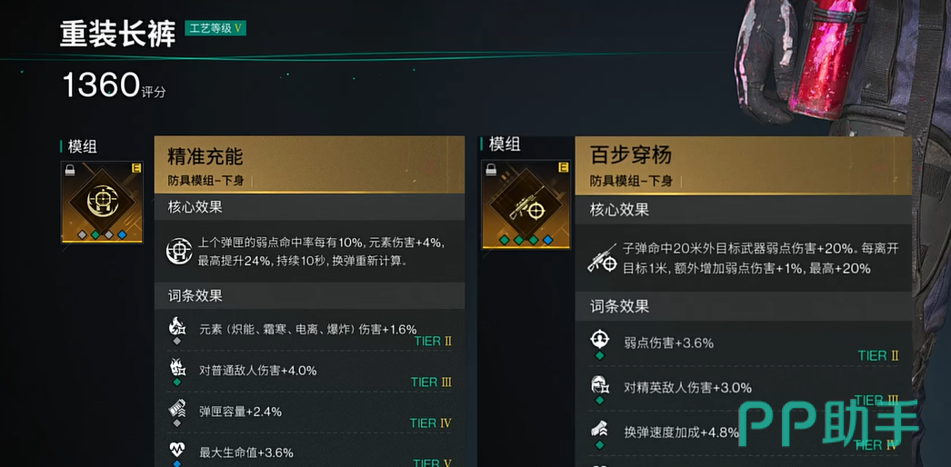 不过,巨物传说的核心优势就是爆弹伤害,所以选择能够提升爆弹伤害的模组非常重要。爆弹充能是对它极为合适的选择,因为它能够提高爆弹的伤害上限,让你的攻击更加致命。在模组的搭配上,头部模组可以选择精准打击或异常伤害,而面罩的爆破专注更能帮助你提升爆弹的效果。长裤推荐使用“百步穿杨”,让你在远程精准狙击时更具优势。鞋子则搭配掩护备战,提升生存能力。手套上则建议带上弱点强化,增加击中敌人弱点后的伤害。