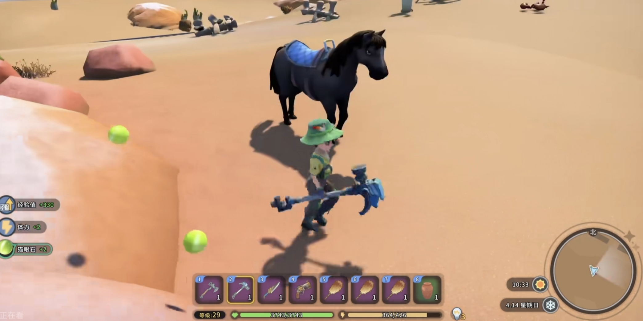 第一处高效率采集点位于主干道中桥正对面的小山丘。该区域地形起伏明显,植被覆盖率较低,裸露岩层呈浅灰带金纹特征,猫眼石矿脉在此集中暴露于地表。玩家骑乘坐骑沿山腰缓行一圈,即可快速识别并采集。无需依赖特定图鉴辨识——矿体自带微光反光效果,在晴朗天气下尤为醒目。该点位刷新周期为现实时间48分钟,属可再生资源点,适合中后期高频次补给。